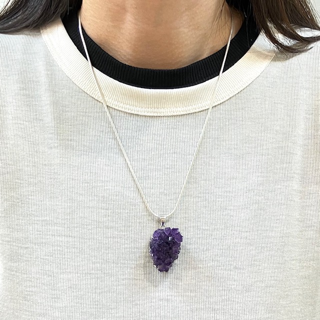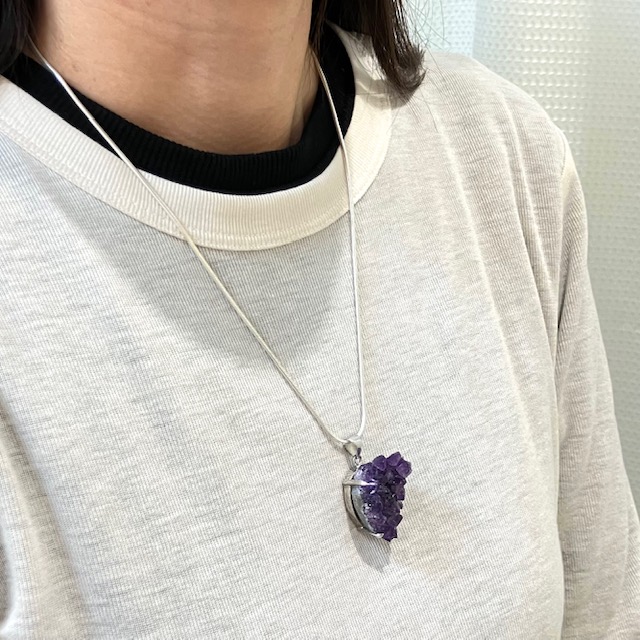 濃い紫色の細かな結晶が煌びやかな輝きを放つ、ウルグアイ産ならではの美しいアメジスト原石を、そのまま身に付けることが出来るペンダントトップです。