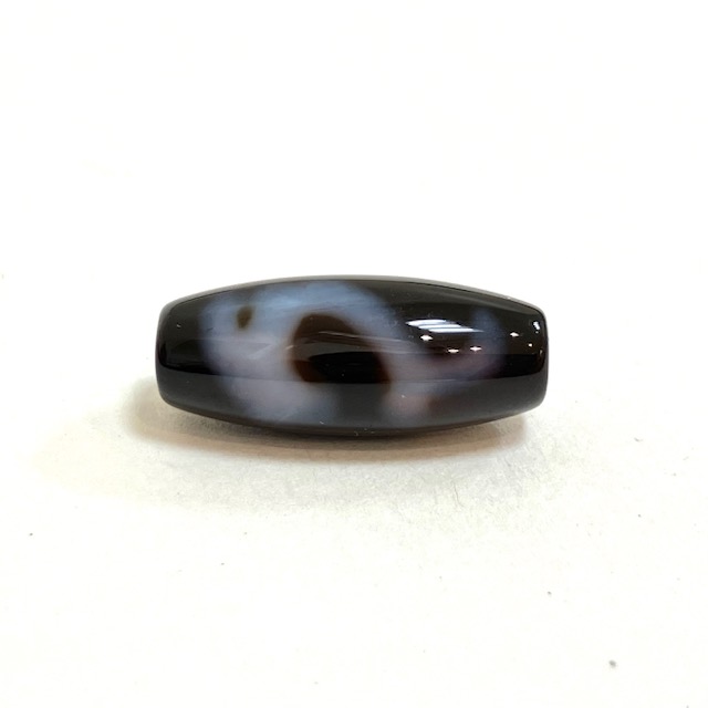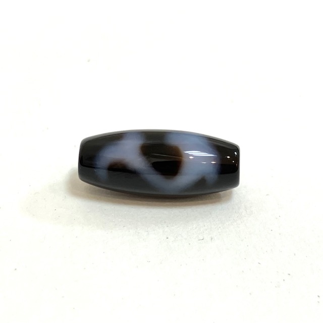 チベット西蔵から各地に伝わったことから、日本では「チベット天珠」と呼ばれており、メノウや玉髄に特殊な薬液をつけ円筒形に研磨加工し、表面に吉祥文様を焼き付けています。