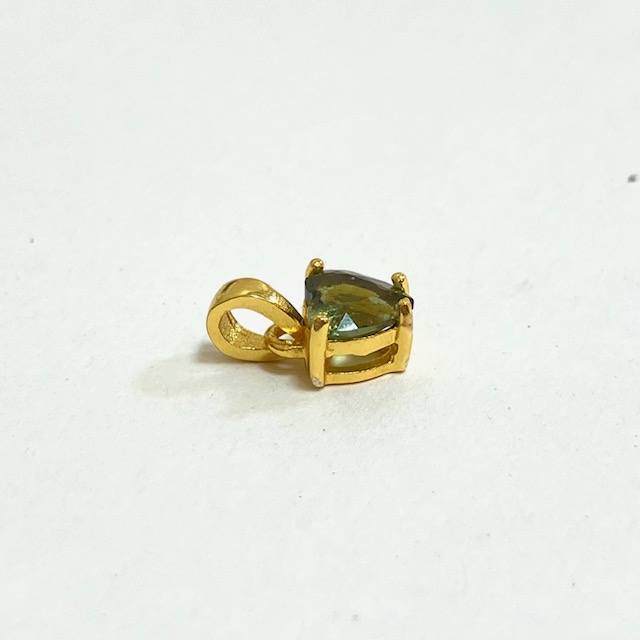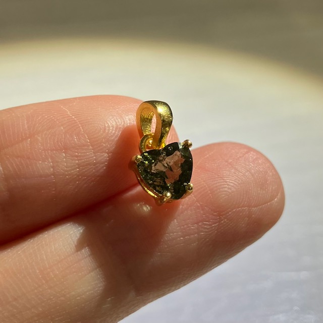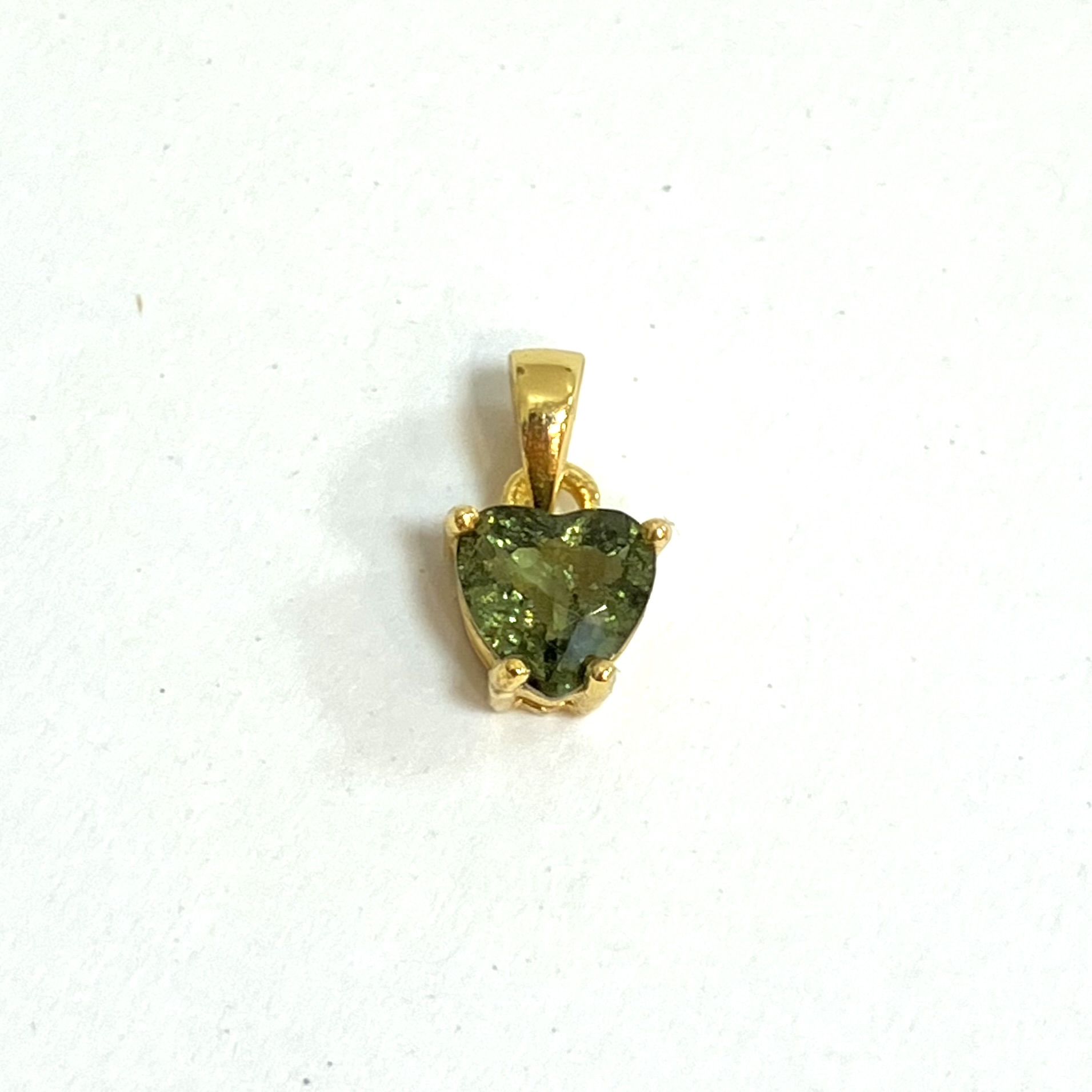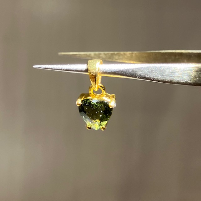 ハート型にカットされたオリーブグリーンのストーンが、18KGPの台座に嵌め込まれています。