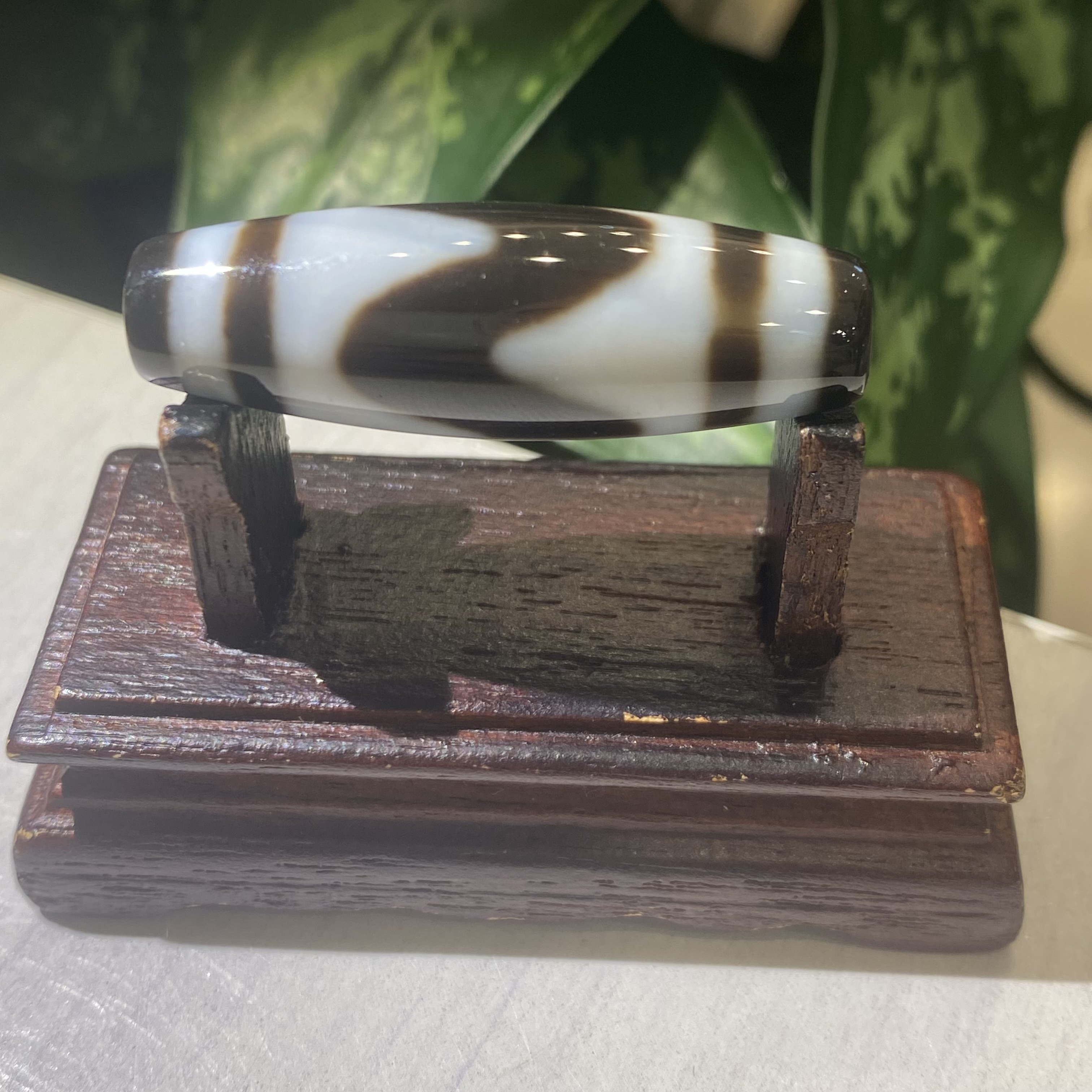 チベット西蔵から各地に伝わったことから、日本では「チベット天珠」と呼ばれており、メノウや玉髄に特殊な薬液をつけ円筒形に研磨加工し、表面に吉祥文様を焼き付けています。