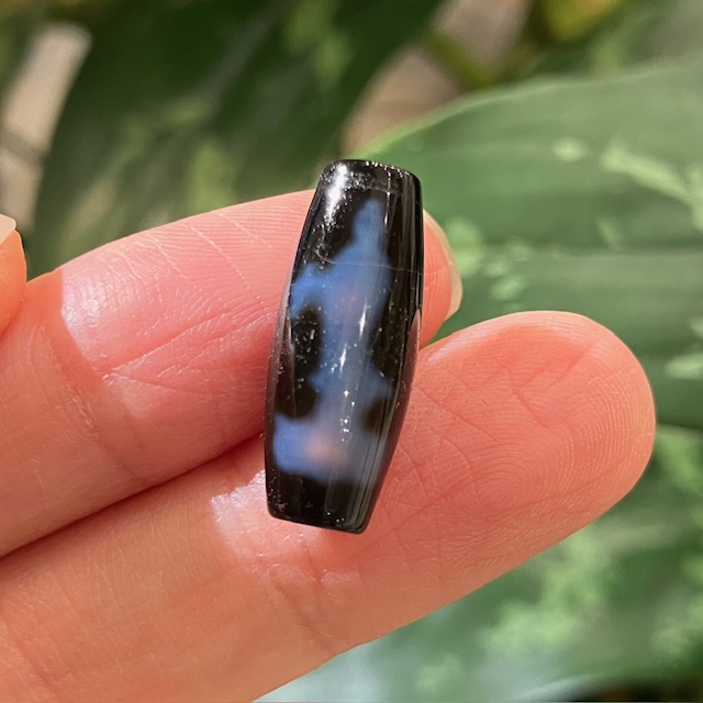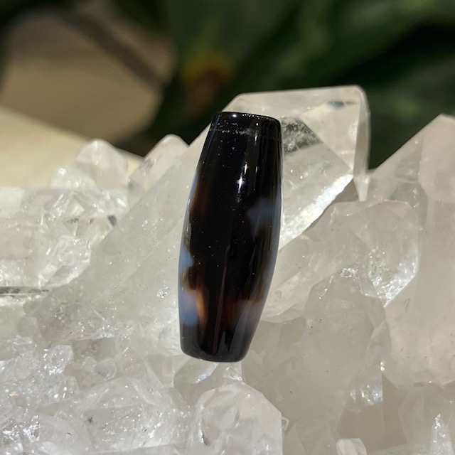 チベット西蔵から各地に伝わったことから、日本では「チベット天珠」と呼ばれており、メノウや玉髄に特殊な薬液をつけ円筒形に研磨加工し、表面に吉祥文様を焼き付けています。