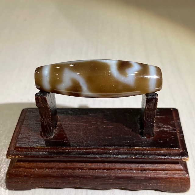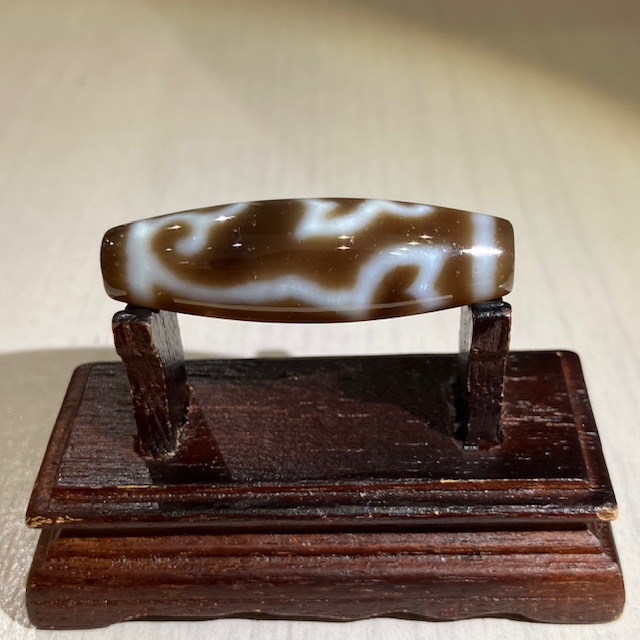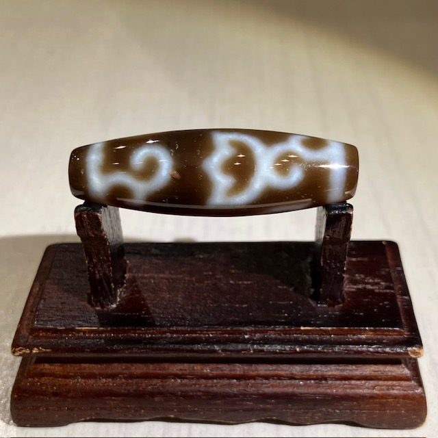 チベット西蔵から各地に伝わったことから、日本では「チベット天珠」と呼ばれており、メノウや玉髄に特殊な薬液をつけ円筒形に研磨加工し、表面に吉祥文様を焼き付けています。