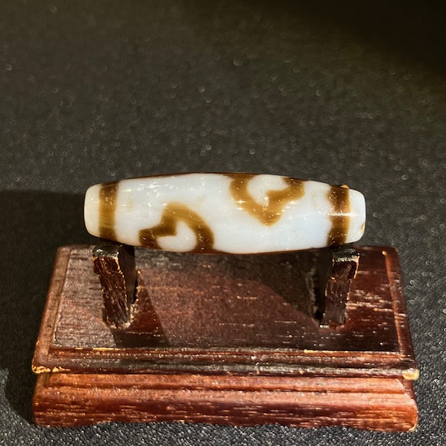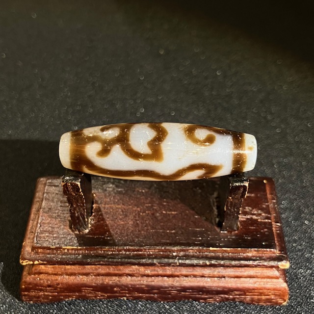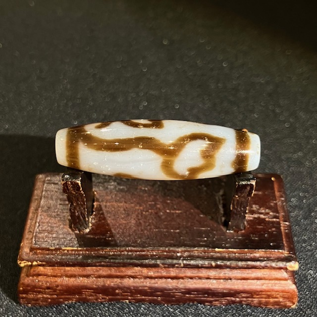チベット西蔵から各地に伝わったことから、日本では「チベット天珠」と呼ばれており、メノウや玉髄に特殊な薬液をつけ円筒形に研磨加工し、表面に吉祥文様を焼き付けています。