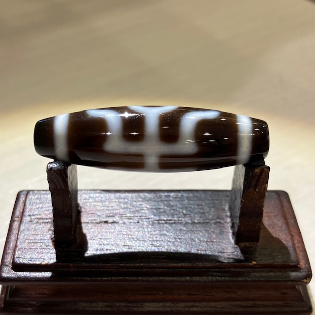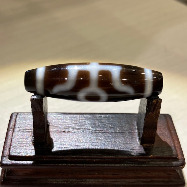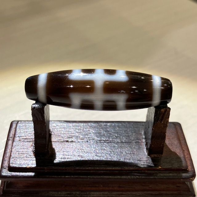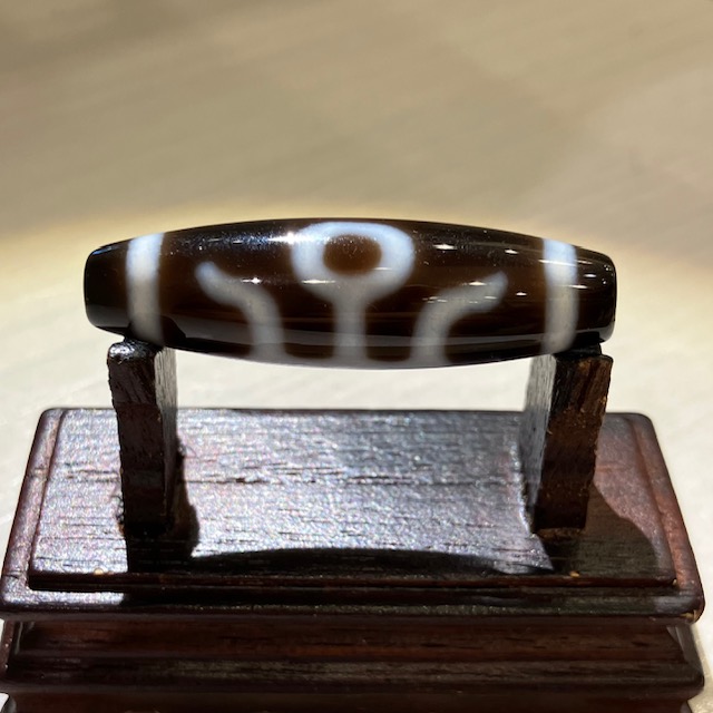 チベット西蔵から各地に伝わったことから、日本では「チベット天珠」と呼ばれており、メノウや玉髄に特殊な薬液をつけ円筒形に研磨加工し、表面に吉祥文様を焼き付けています。