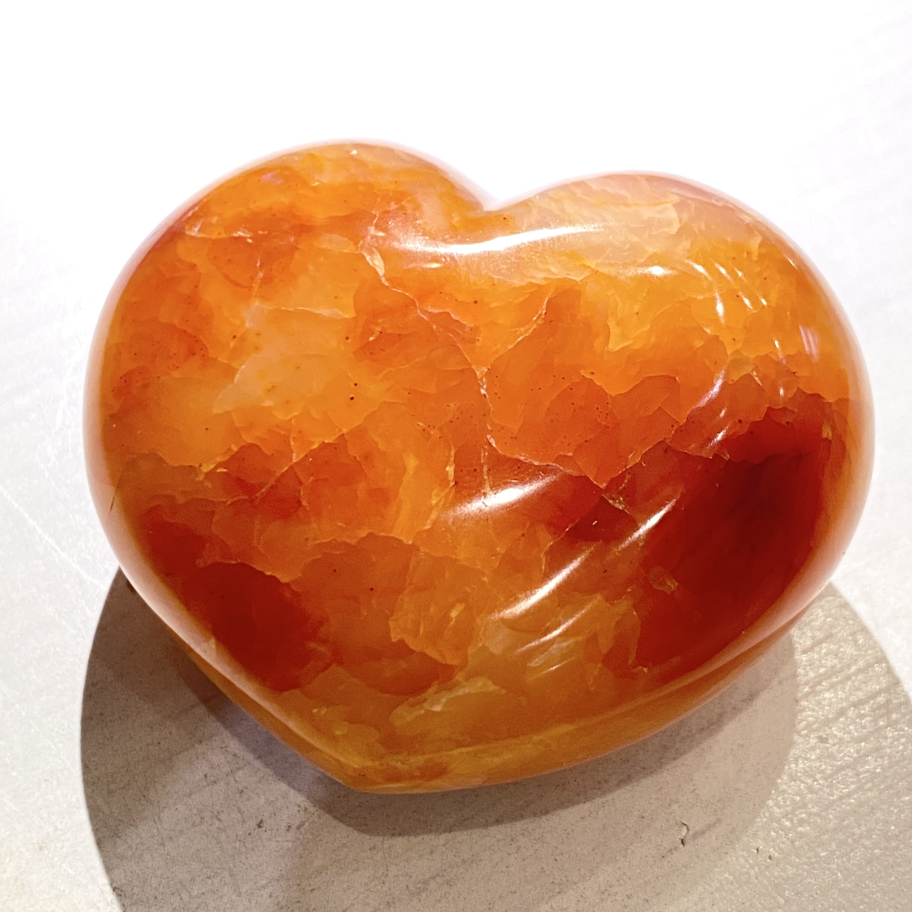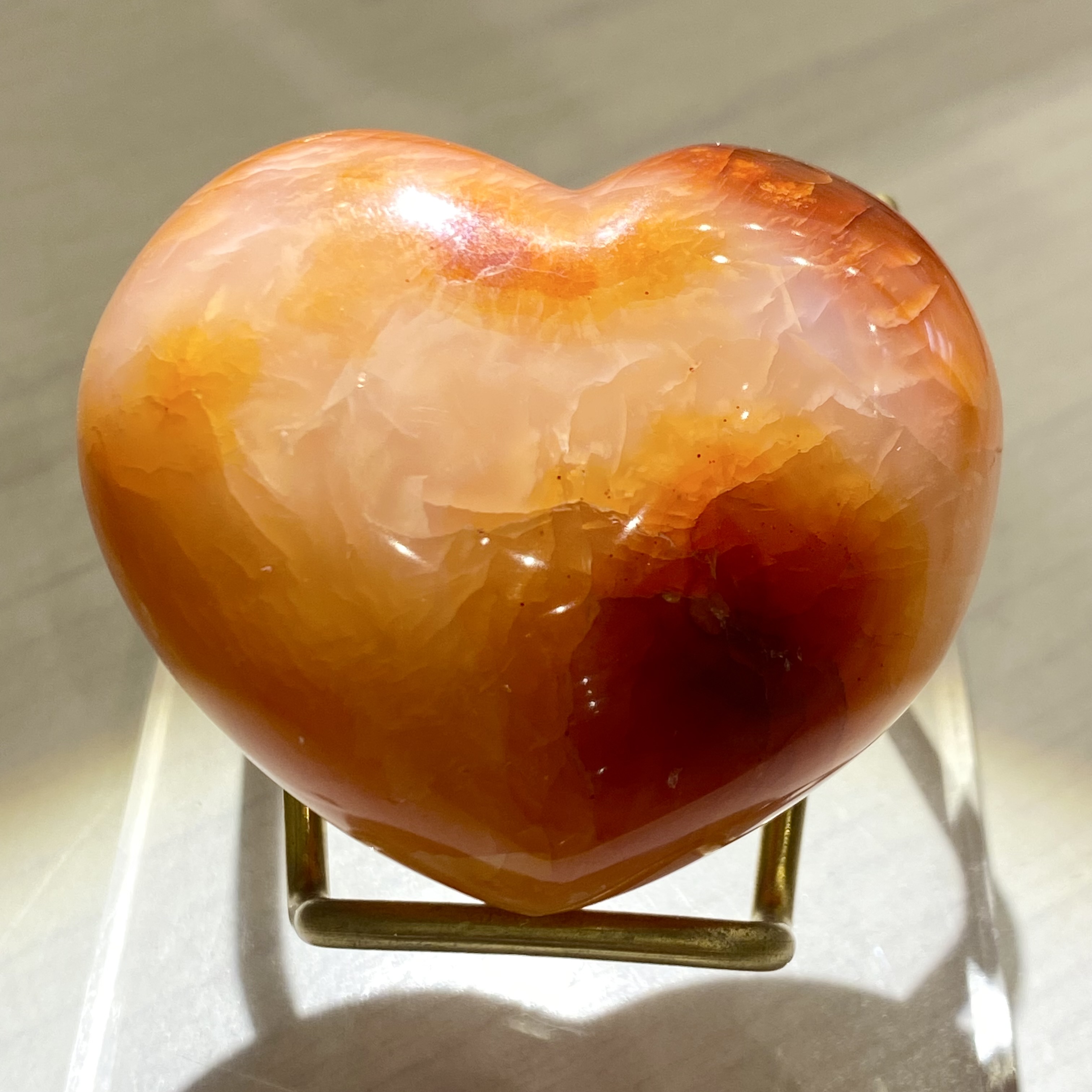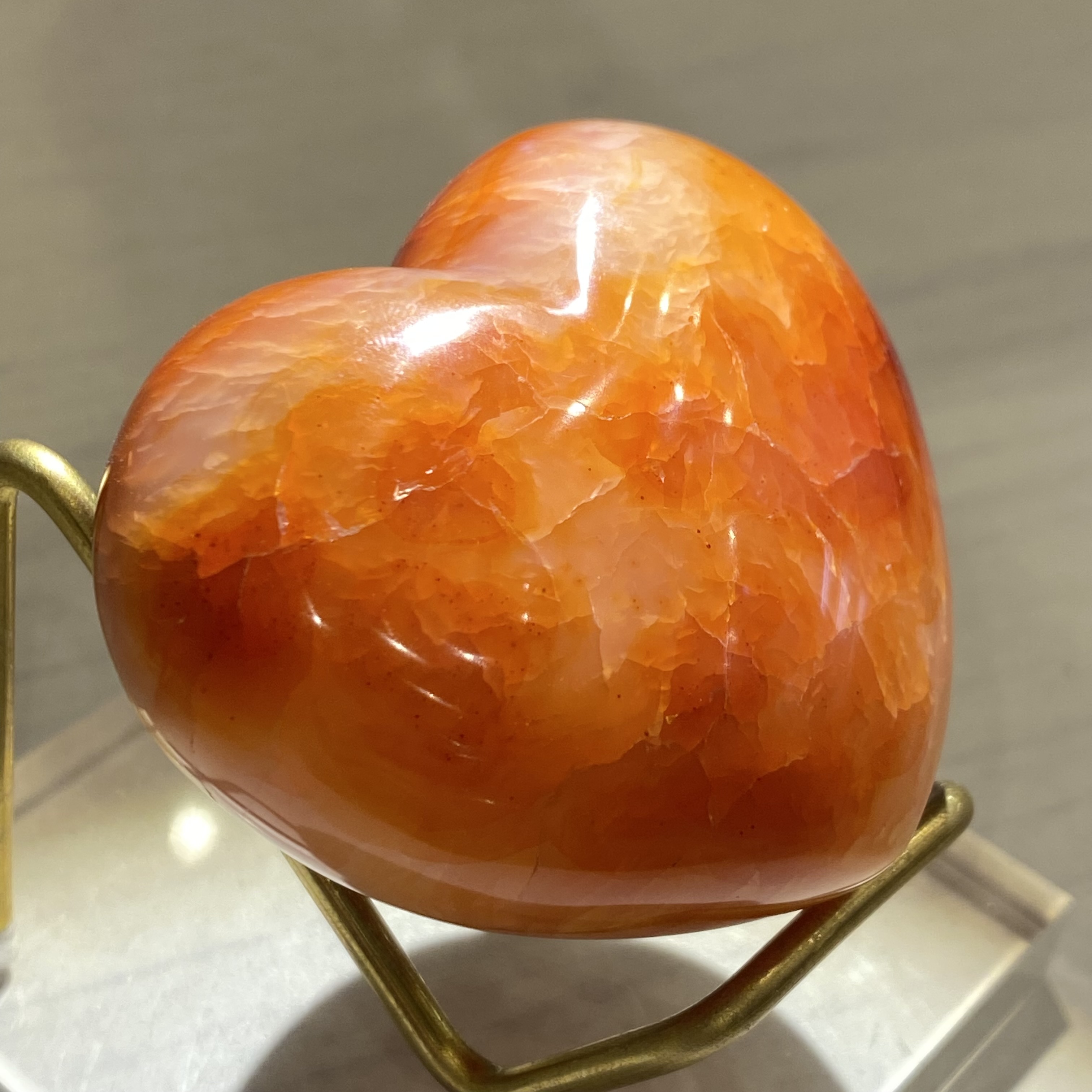 ホワイトのベースカラーに鮮やかなオレンジや赤色が浮かび上がり、金魚のような模様をしたハート型原石です。