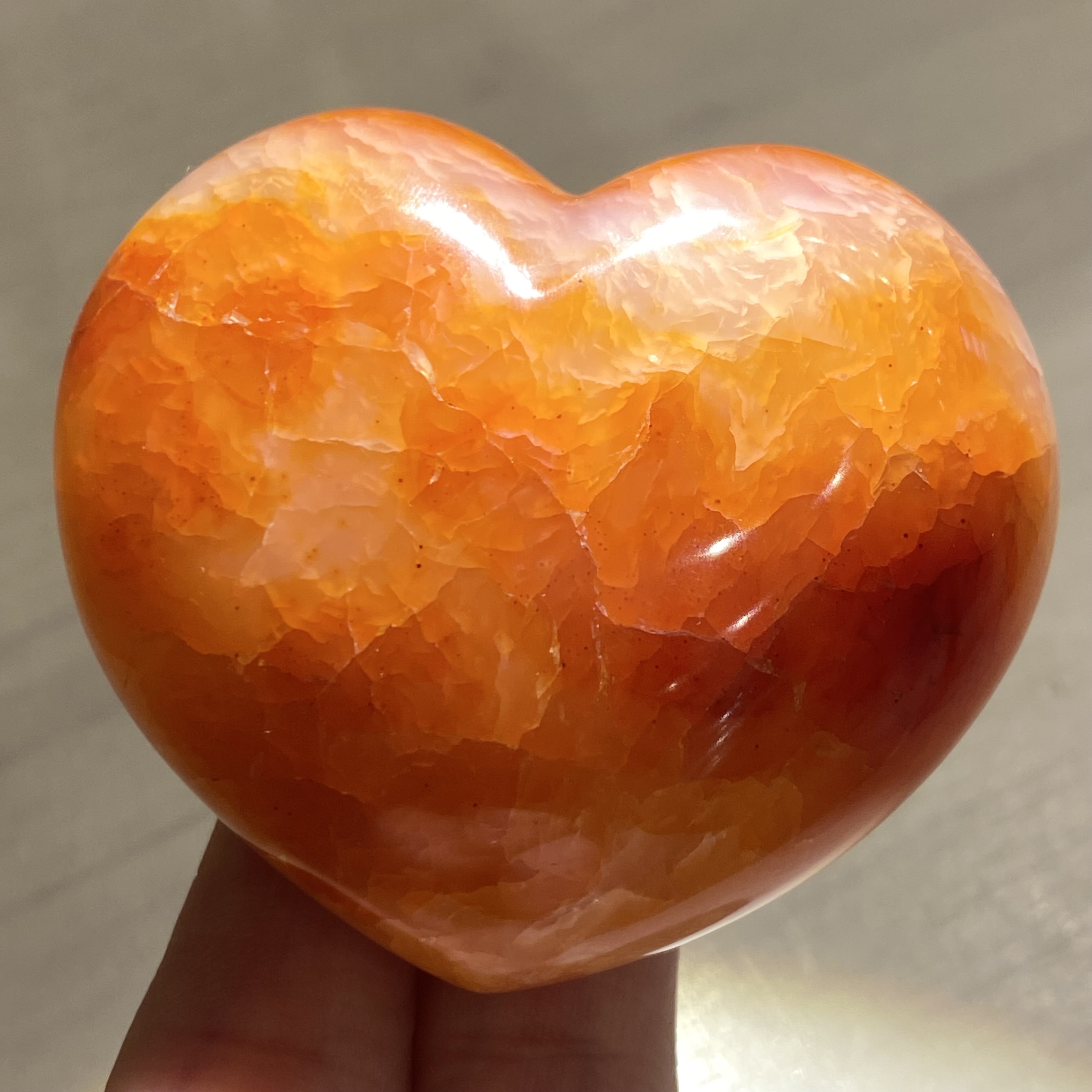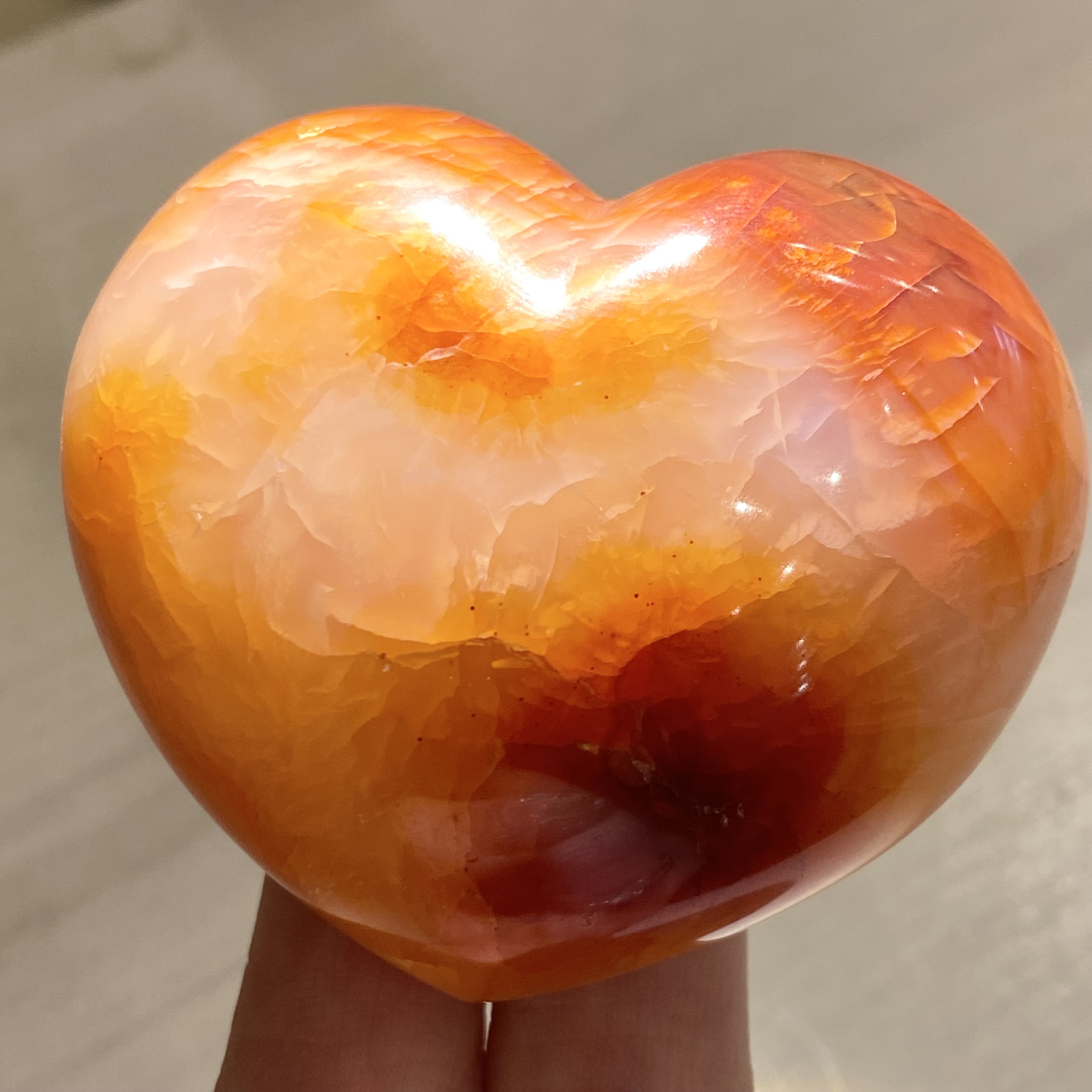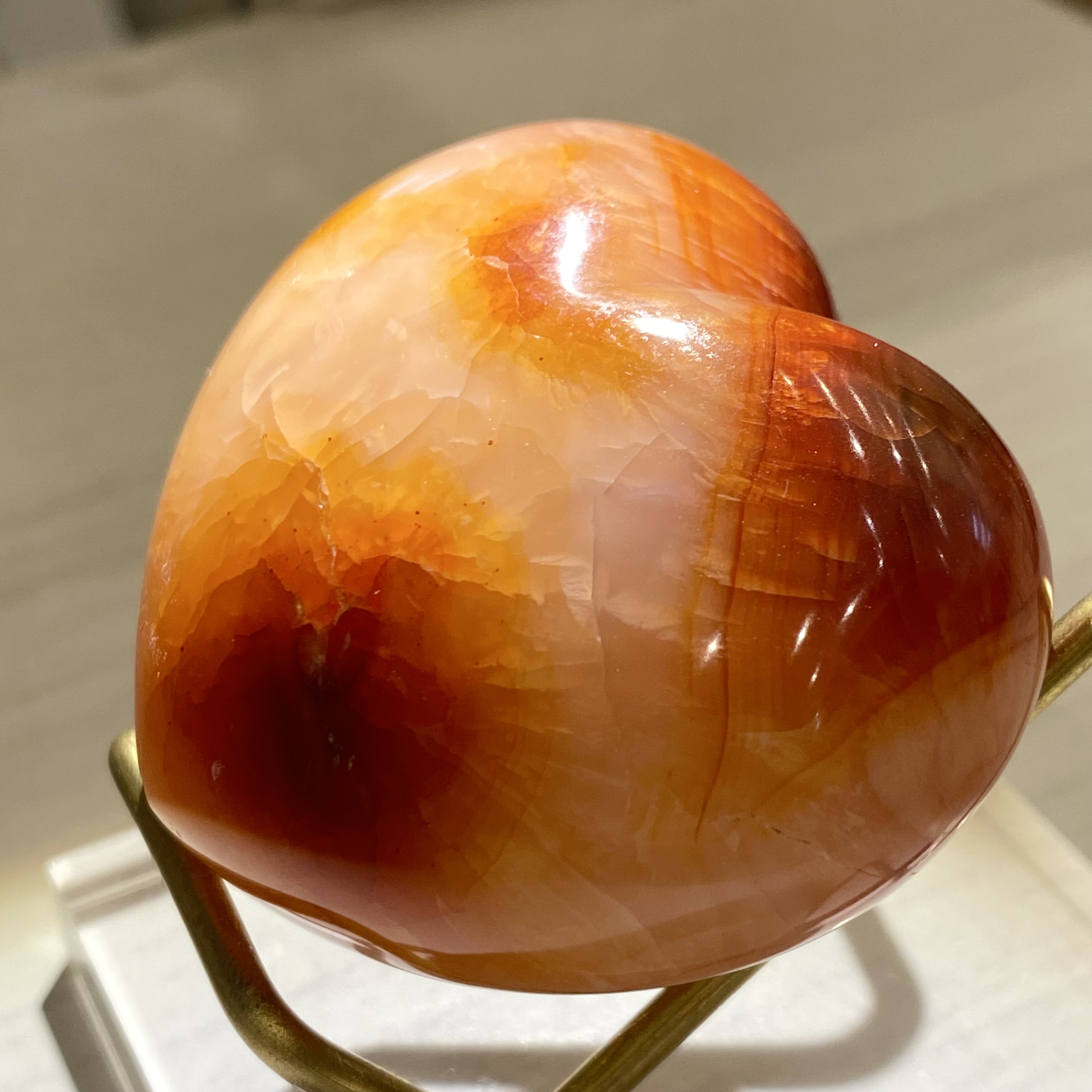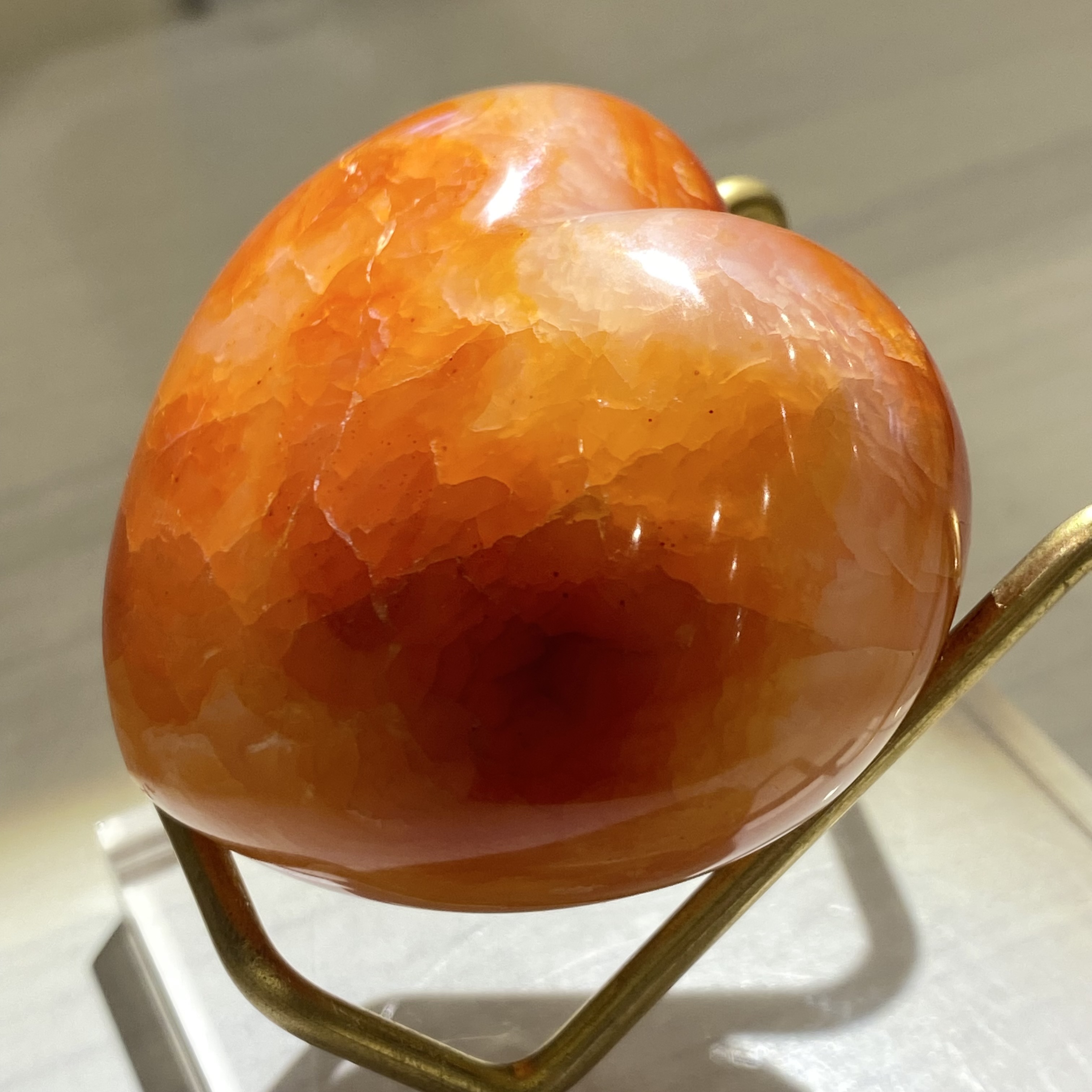 ホワイトのベースカラーに鮮やかなオレンジや赤色が浮かび上がり、金魚のような模様をしたハート型原石です。