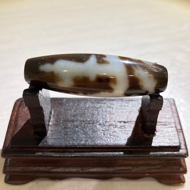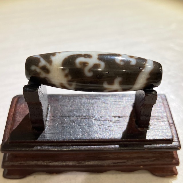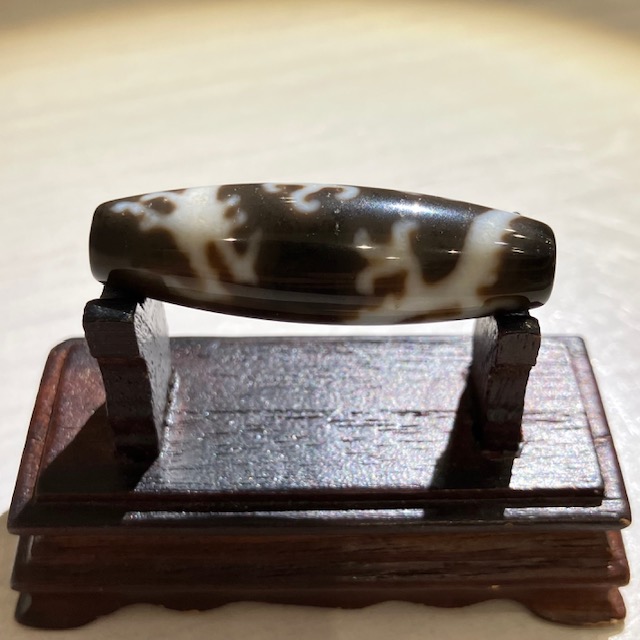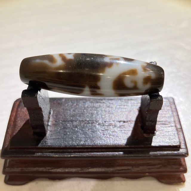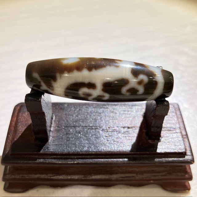 チベット西蔵から各地に伝わったことから、日本では「チベット天珠」と呼ばれており、メノウや玉髄に特殊な薬液をつけ円筒形に研磨加工し、表面に吉祥文様を焼き付けています。