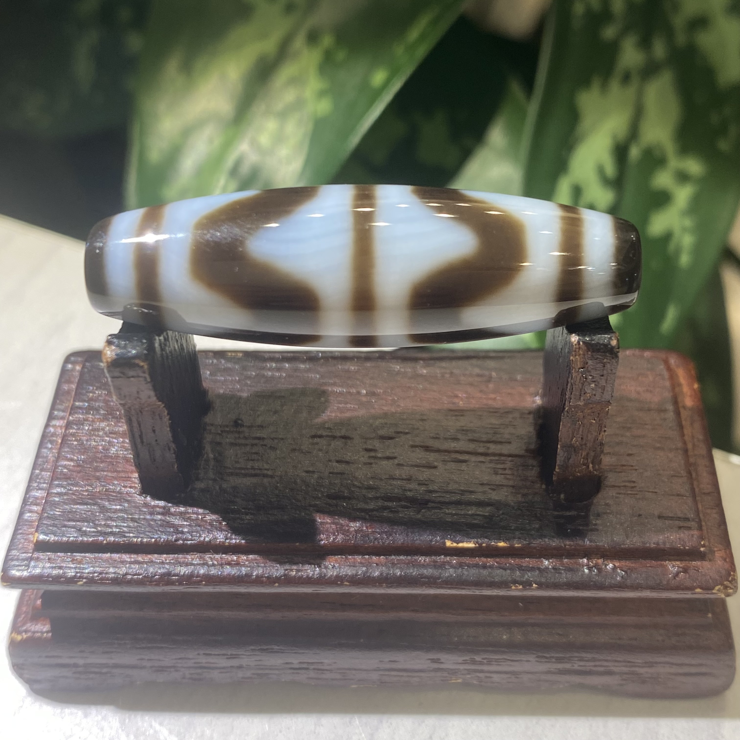 チベット西蔵から各地に伝わったことから、日本では「チベット天珠」と呼ばれており、メノウや玉髄に特殊な薬液をつけ円筒形に研磨加工し、表面に吉祥文様を焼き付けています。