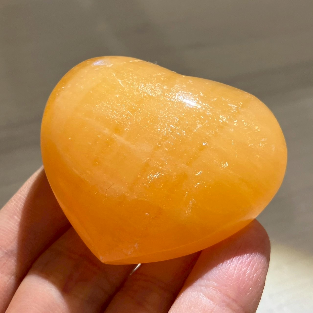 ぷっくりとしたハート形がかわいらしい、オレンジカルサイトのハート原石です。