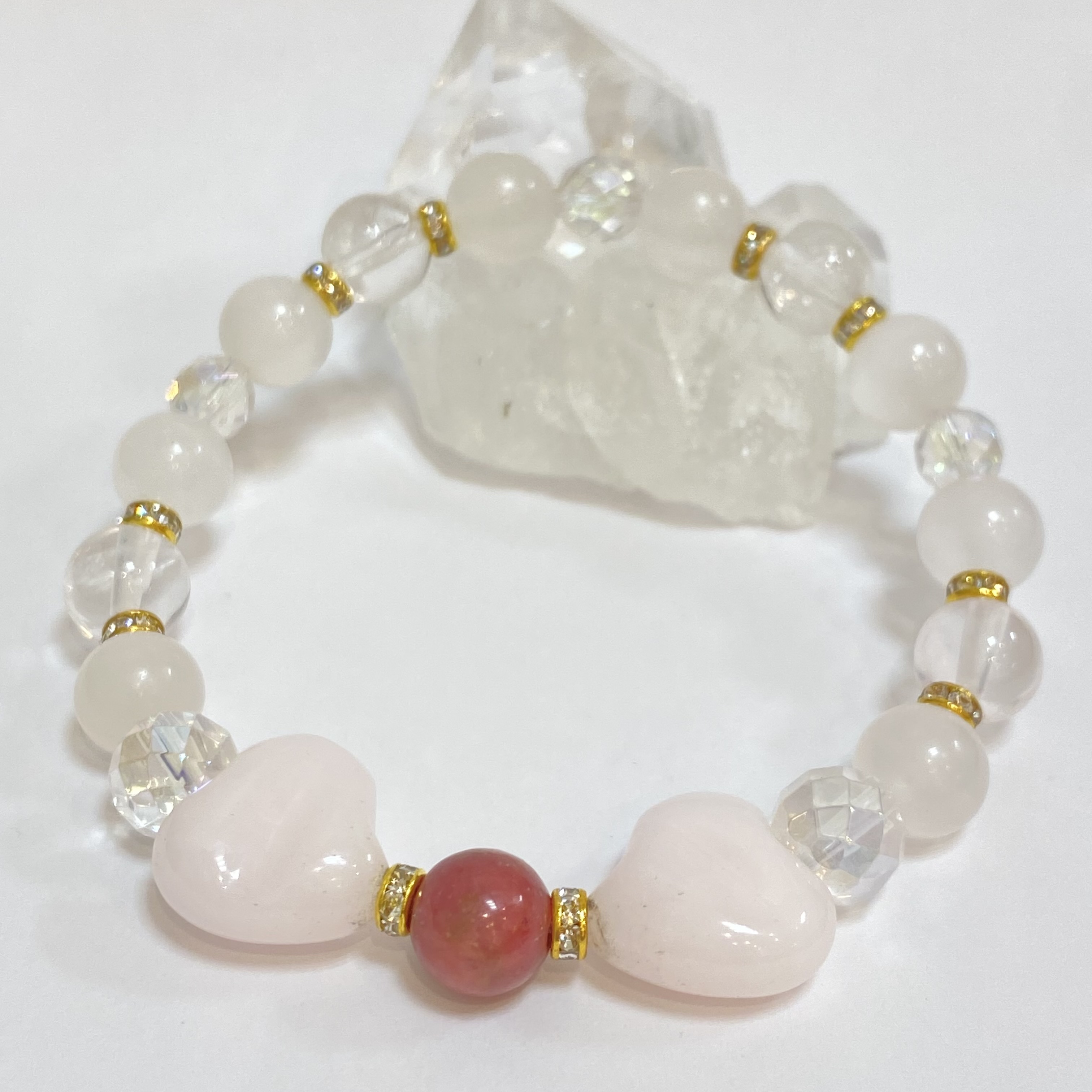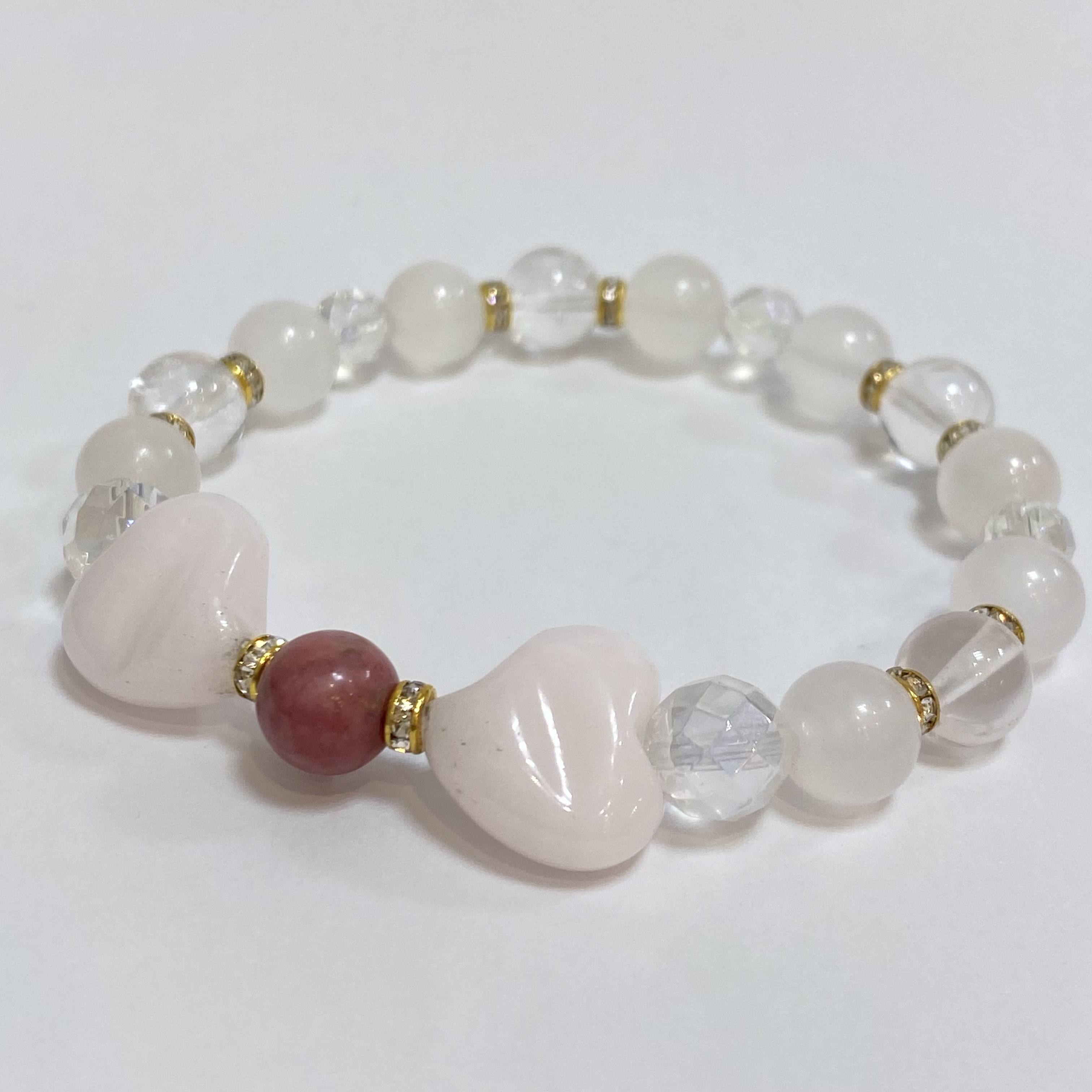 【天然石ブレスレット】ピンクカルサイト&ロードナイト&レインボーオーラ&スターローズクォーツ〈恋愛〉