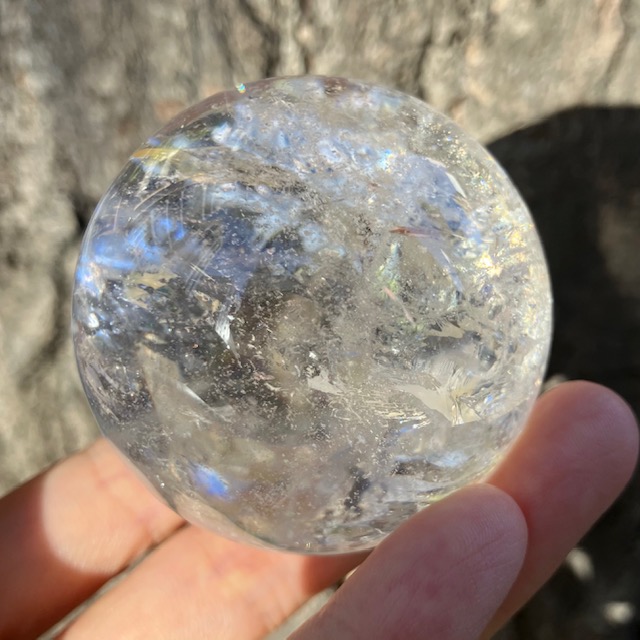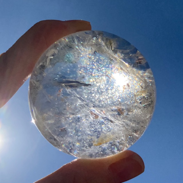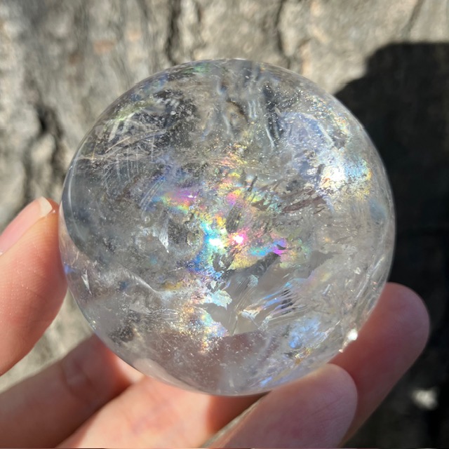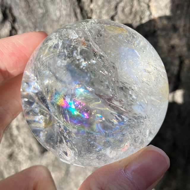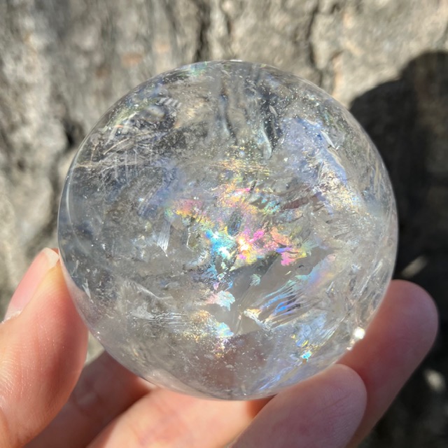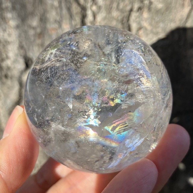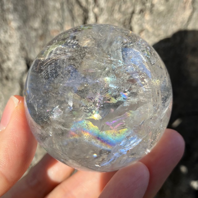 透明感の高いクリスタルの内部に七色に輝く虹が見られる、アイリスクォーツ(レインボークォーツ)の丸玉原石です。