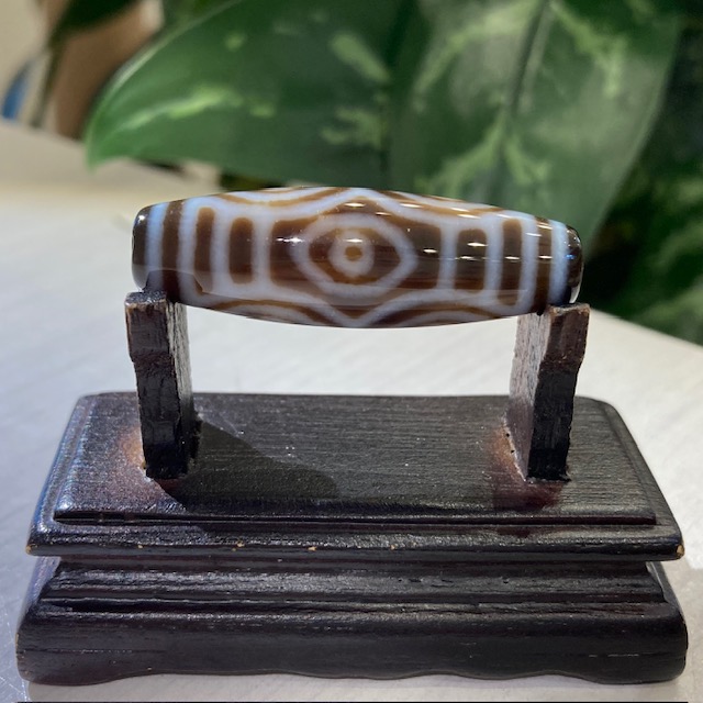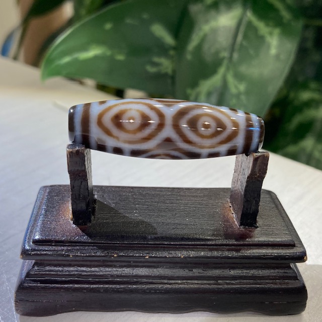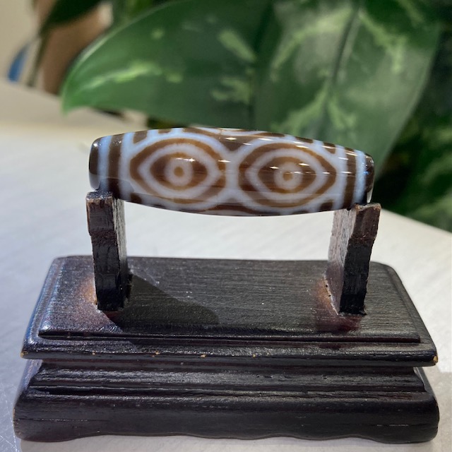 チベット西蔵から各地に伝わったことから、日本では「チベット天珠」と呼ばれており、メノウや玉髄に特殊な薬液をつけ円筒形に研磨加工し、表面に吉祥文様を焼き付けています。