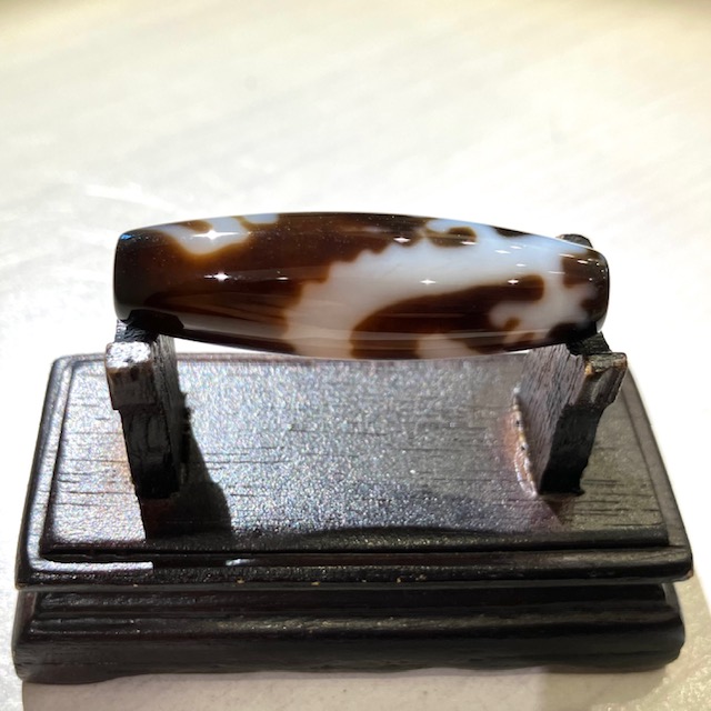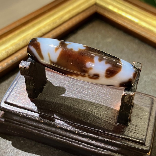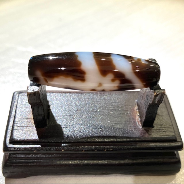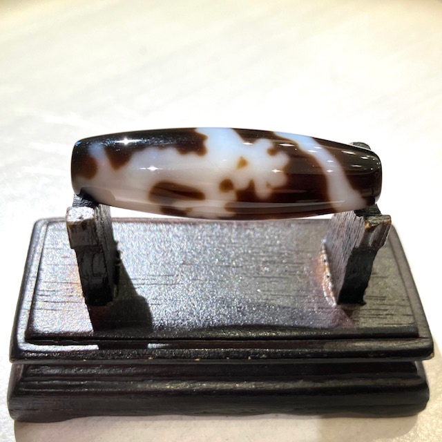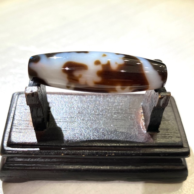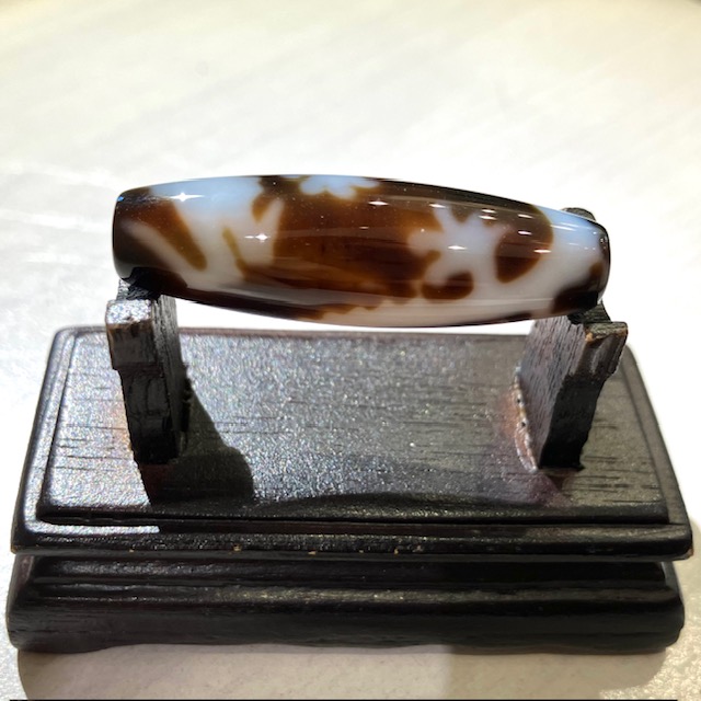チベット西蔵から各地に伝わったことから、日本では「チベット天珠」と呼ばれており、メノウや玉髄に特殊な薬液をつけ円筒形に研磨加工し、表面に吉祥文様を焼き付けています。