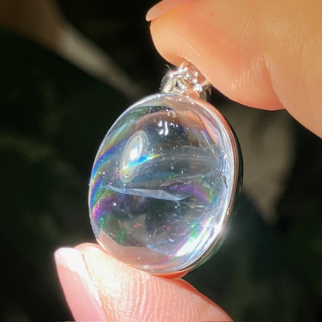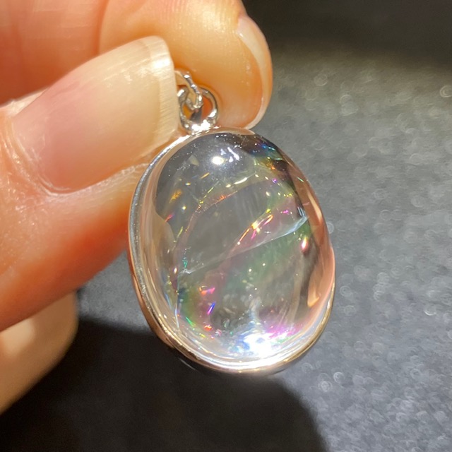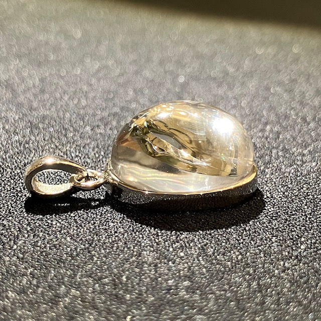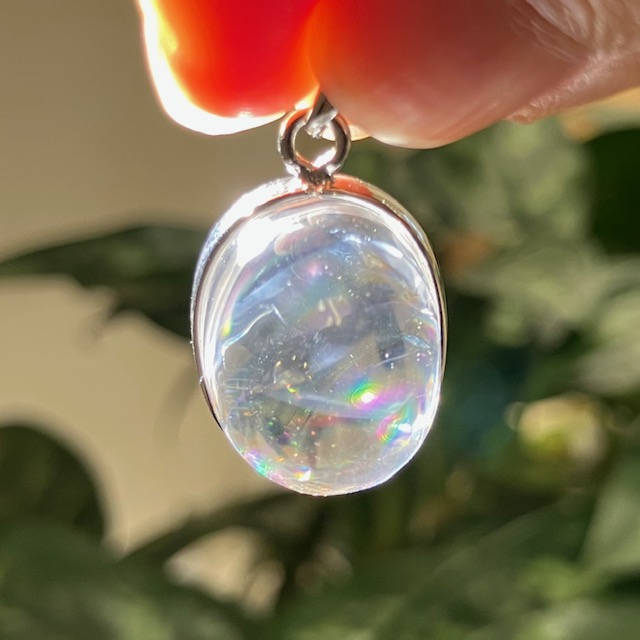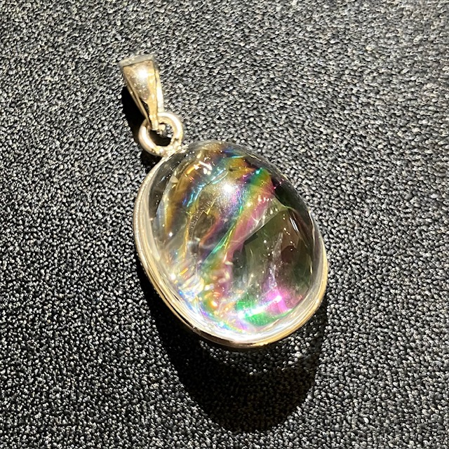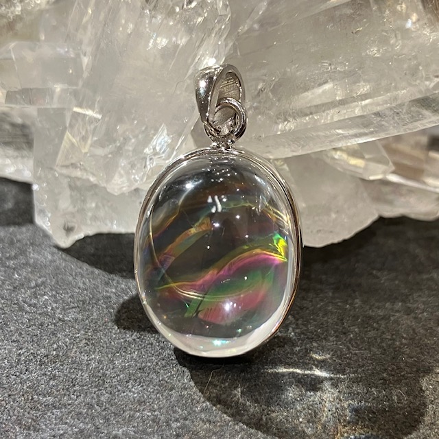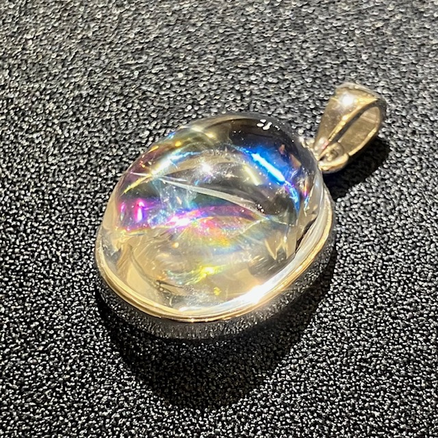透明感の高い良質な水晶内部に七色に輝く虹が見られる、アイリスクォーツ(レインボークォーツ)のペンダントトップです。