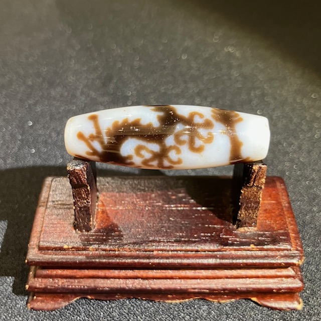 チベット西蔵から各地に伝わったことから、日本では「チベット天珠」と呼ばれており、メノウや玉髄に特殊な薬液をつけ円筒形に研磨加工し、表面に吉祥文様を焼き付けています。